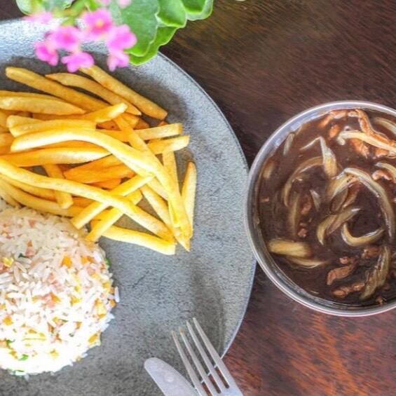 Deliciosa carne com cebola + arroz misto + batata frita (os itens, não podem ser substituídos)
