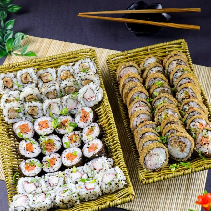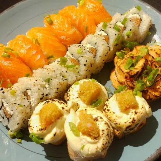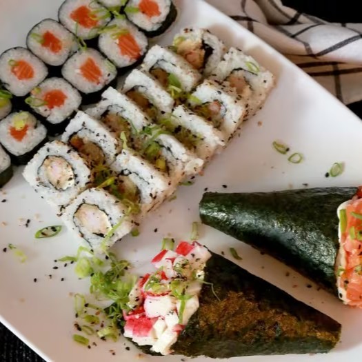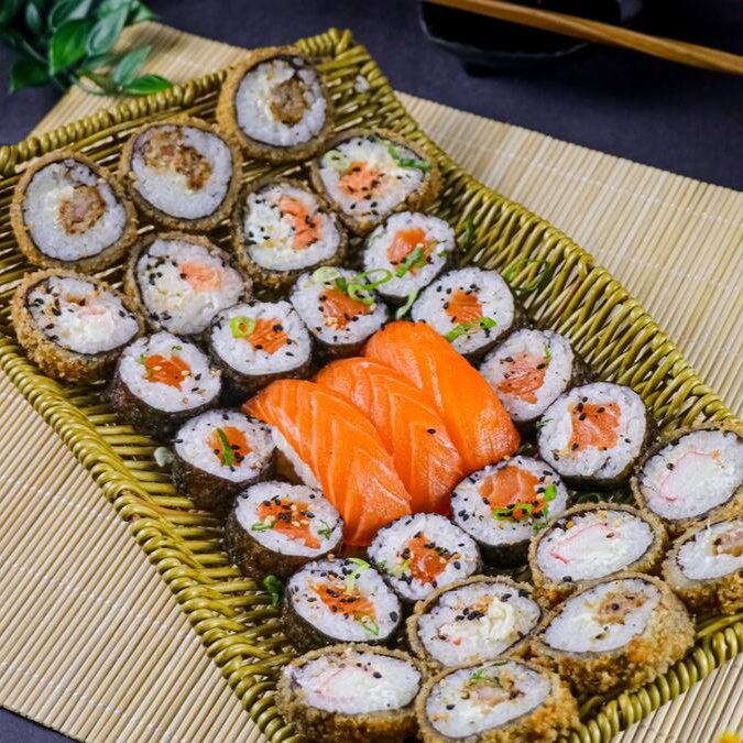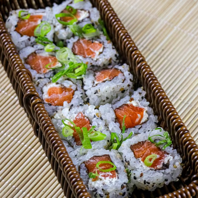 Alga com um super recheio de salmão fresquinho,kani e camarão crocante, arroz e finalizado com cream cheese e um toque especial de cebolinho!