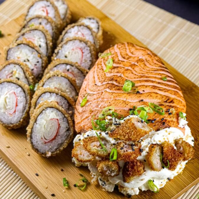 Proposta totalmente diferente de tudo que você já viu, essa belezura, vem Envolto de Salmão Fresquinho, recheado de Arroz, Cream Cheese, Camarões Crocante e claro, um toque especial do Chef.