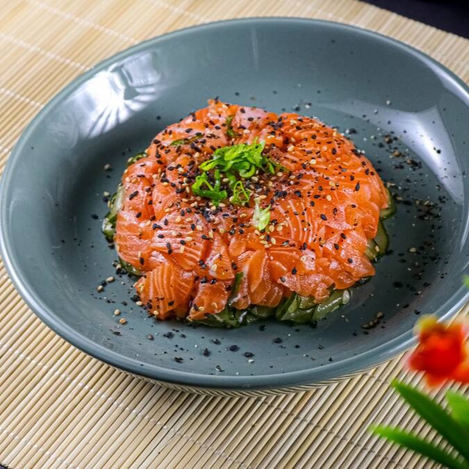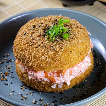 Alga nori empanada e crocante, recheada com arroz, cream cheese e uma incrível pasta de salmão grelhado no ponto perfeito.