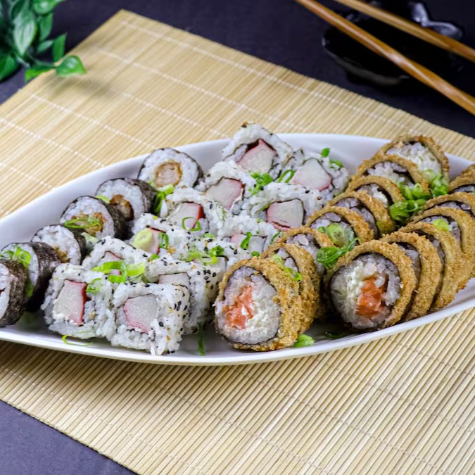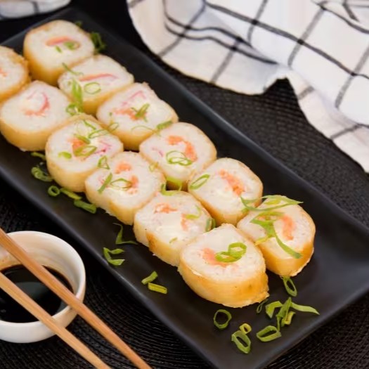 Uma crocante e deliciosa Massa de harumaki, com recheio de arroz, salmão ,kani e cream cheese.