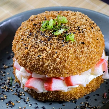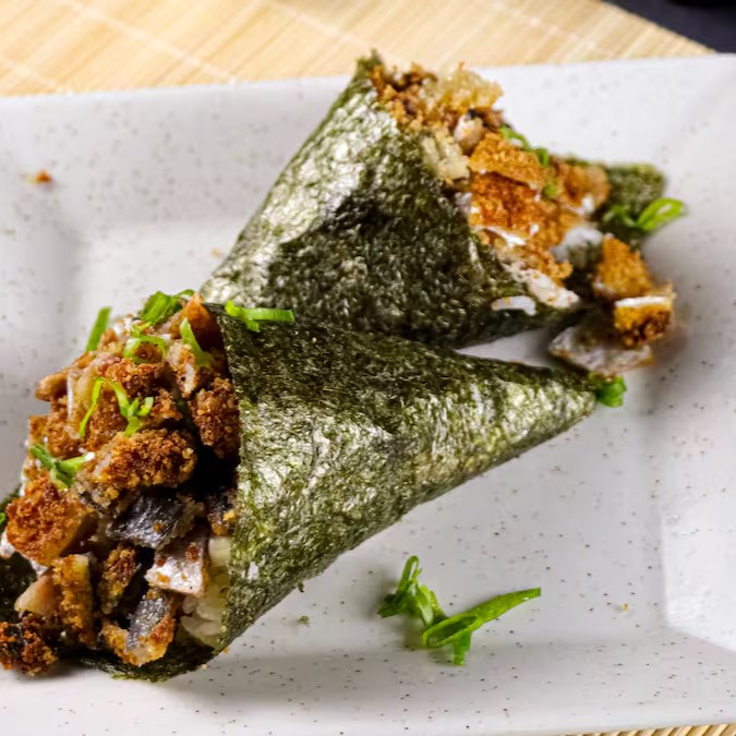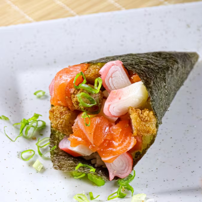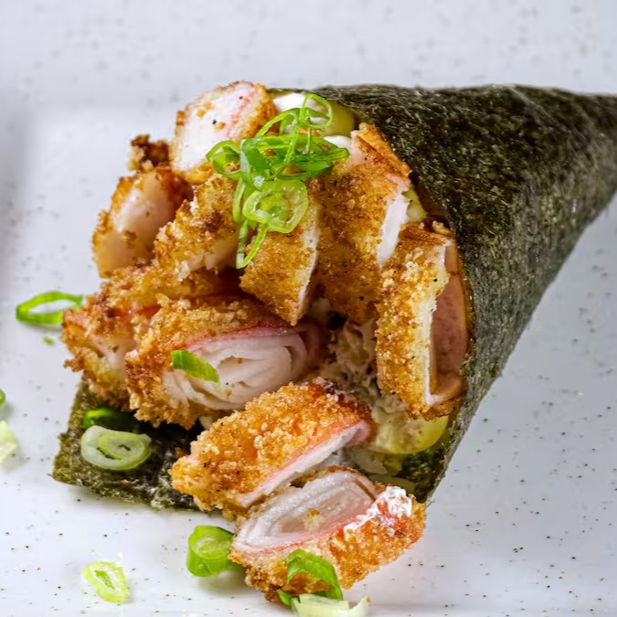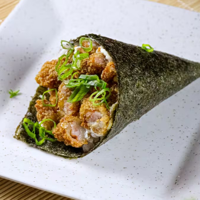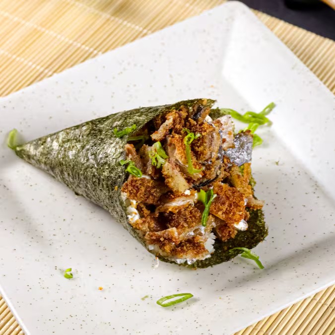 Enrolado em alga em forma de cone, recheado de arroz,cream cheese e kani kama empanado na farinha panko, com finalização de cebolinha!
