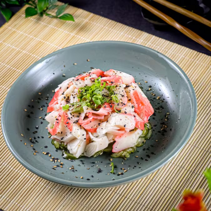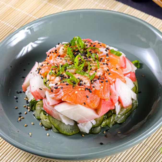 Salada de pepino, cubos de kani ,salmão e peixe branco cobertos de gergelim.