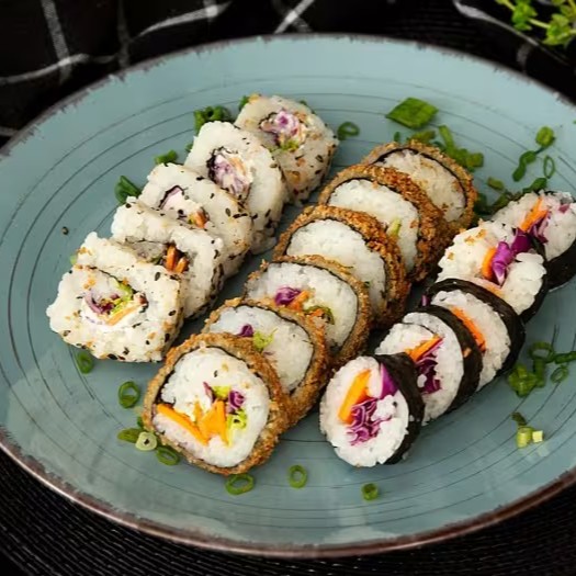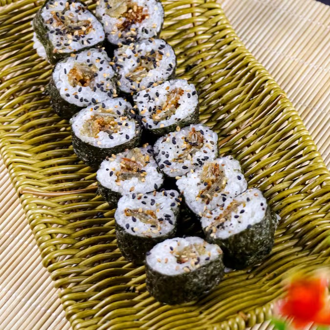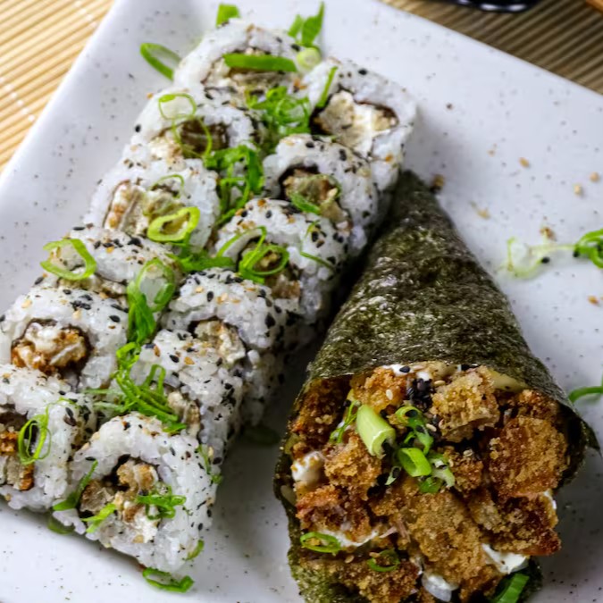 Arroz enrolado na alga nori com recheio de camarão crocante e cream cheese.
