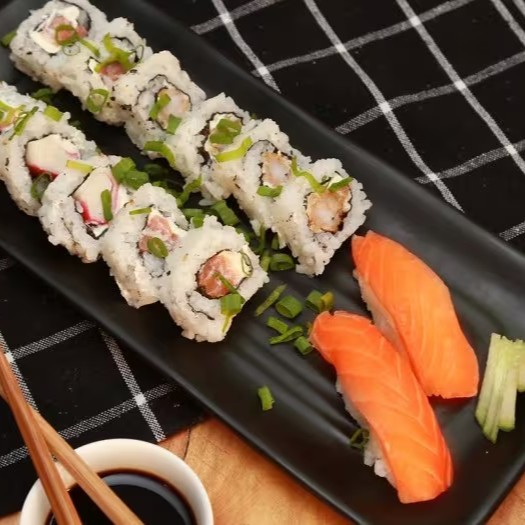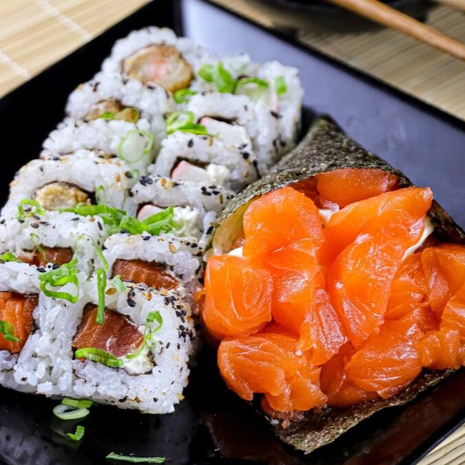 Nosso delicioso combo de um Temaki e 10 Peças de Uramaki de Salmão grelhado, temperados com um toque especial do chef.