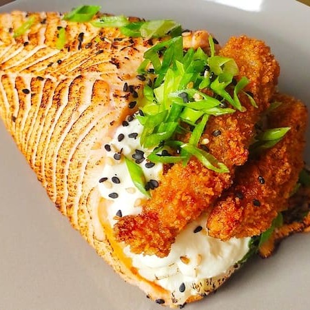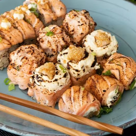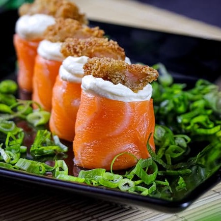 Deliciosa manta de Salmão recheado de arroz, cream cheese e camarões crocantes e um toque de cebolinho.