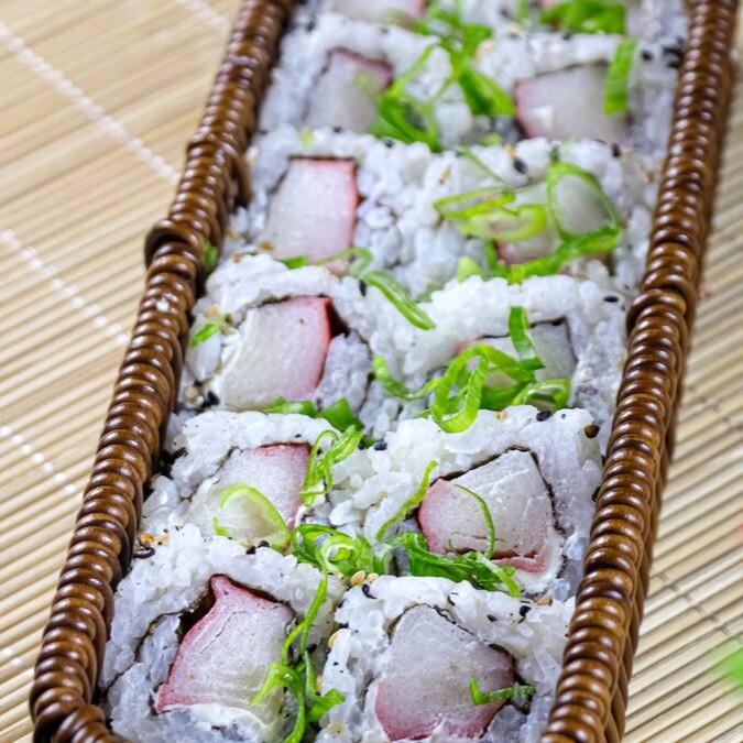 Arroz enrolado na alga nori com recheio de kani e cream cheese.