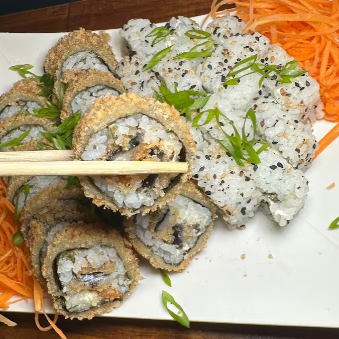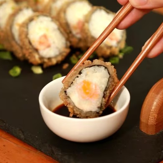 Alga nori empanada e crocante com recheio de arroz, cream cheese e deliciosos camarões crocantes, acompanha cebolinho!