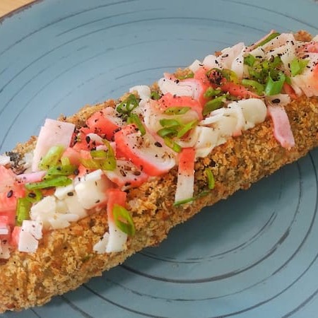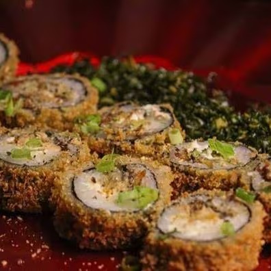 Alga nori empanada e crocante com recheio de arroz, cream cheese e deliciosos cubos de Kani Kama, acompanha cebolinho!