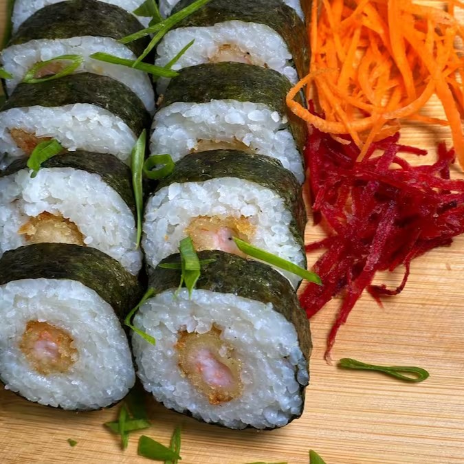 Arroz enrolado por dentro do nori com recheio de camarão crocante.