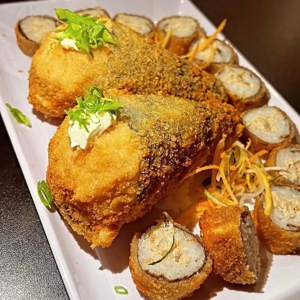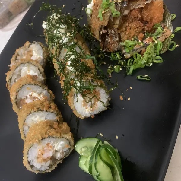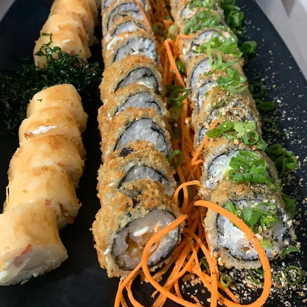 Arroz, camarao e cream cheese envolvidos no nori (folha de algas marinhas) empanado e frito com camarão empanado extra empanado. 10 peças