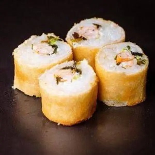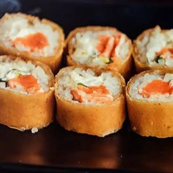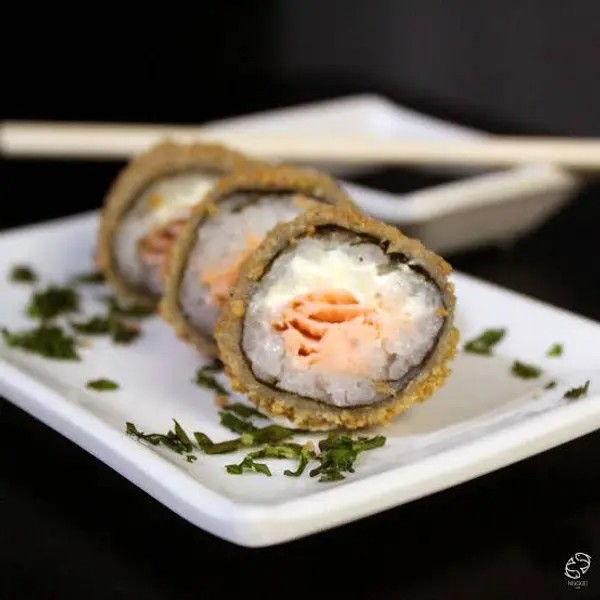 Arroz, salmão e cream cheese envolvidos no nori (folha de algas marinhas) empanado e frito. 10 peças