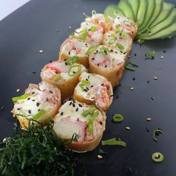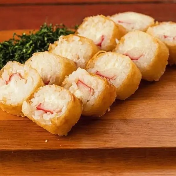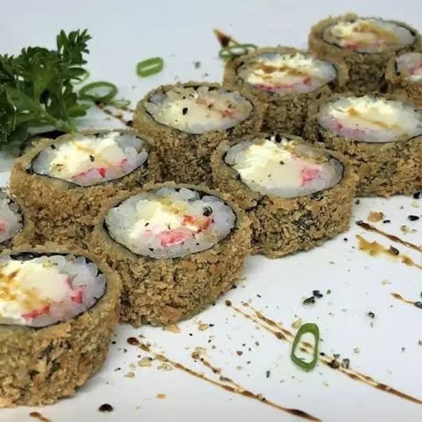 Arroz, kani e cream cheese envolvidos no nori (folha de algas marinhas) empanado e frito. (10 peças)