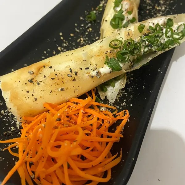 Arroz empanado, cortado aí meio recheado com creme cheese, couve crispy, recheio de sua preferência. Coberto com gergelim torrado e cebolinha.