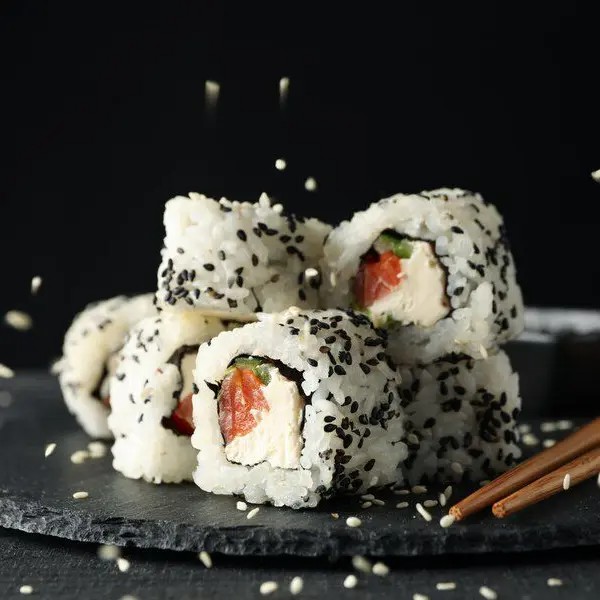 Bolinho de arroz com gergelim, recheado com nori (folha de algas marinhas) salmão e cream cheese. 10 peças