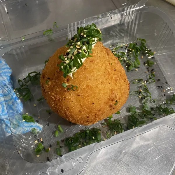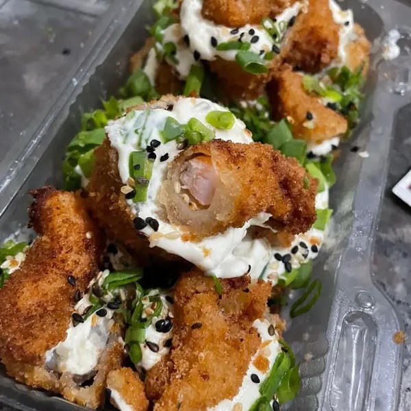 Arroz com creme cheese, recheio de sua preferência, empanado e frito na Panko.