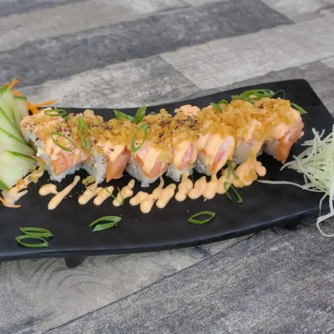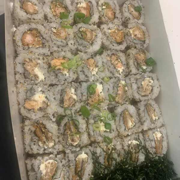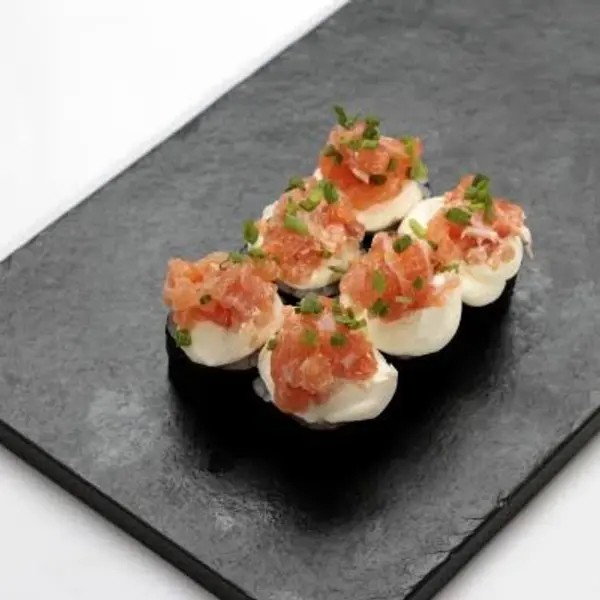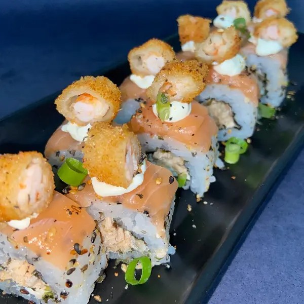 Arroz coberto com gergelim, creme cheese, salmão grelhado, coberto com a lâmina de salmão, camarão empanado em cada.10 unidades