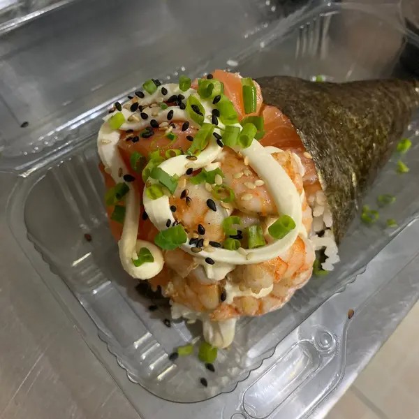 Cone de arroz recheado de salmão, camaão e cream cheese envolvidos no nori (folha de algas marinhas)