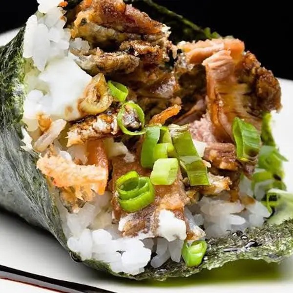 Cone de arroz recheado com pasta de kani e cream cheese, envolvidos no nori (folha de algas marinhas)