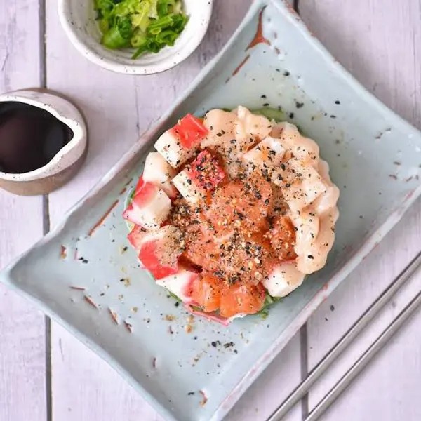 Kani por dentro, pasta de salmão por cima. 10 unidades