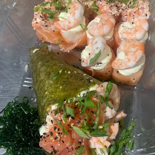 2 temaki + 10 carioca 1 Temaki kani todo empanado 1 Temaki camarão todo empanado 10 carioca salmão grelhado