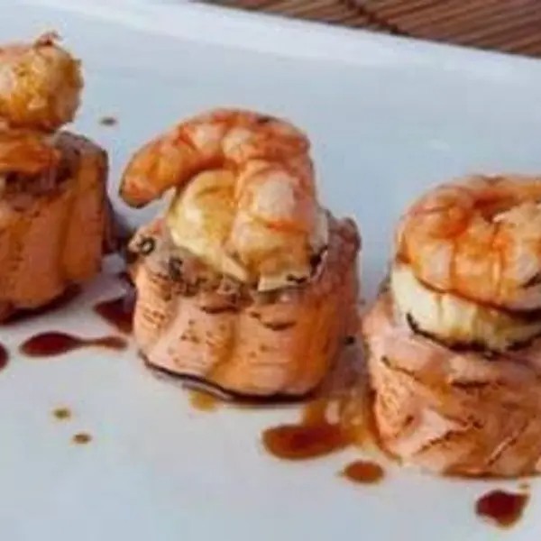 Lâmina de salmão recheada com arroz, camarão e cream cheese (6 unidades)