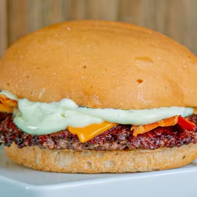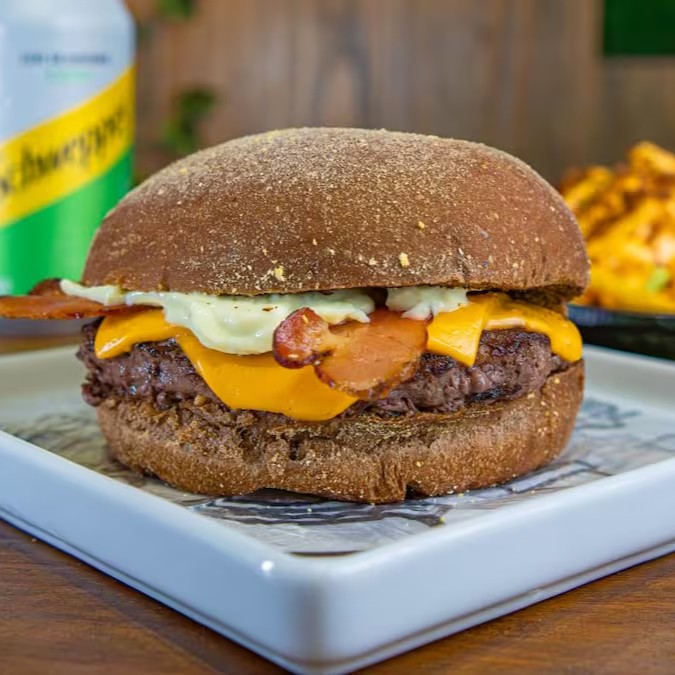 - pão australiano, hambúrguer de carne, queijo cheddar, bacon e molho especial.