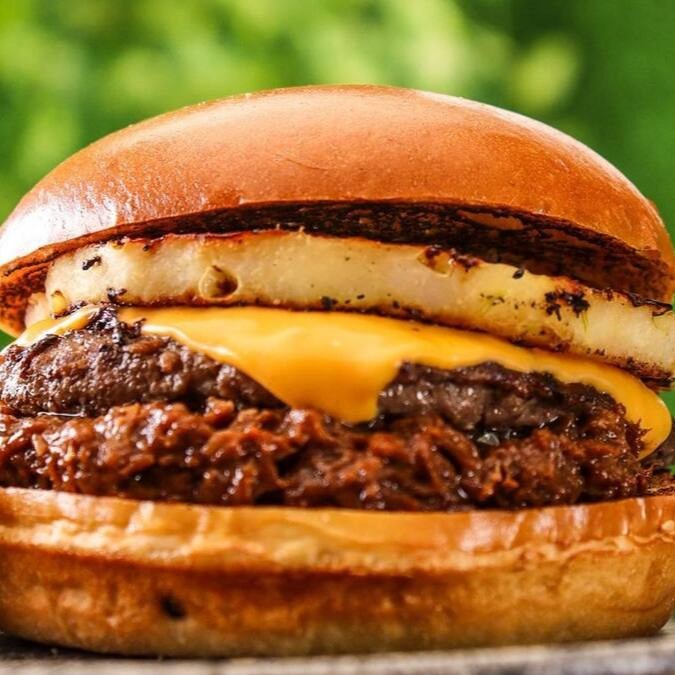 - pão brioche, hambúrguer de carne, costela desfiada e reduzida no barbecue, queijo cheddar e abacaxi.