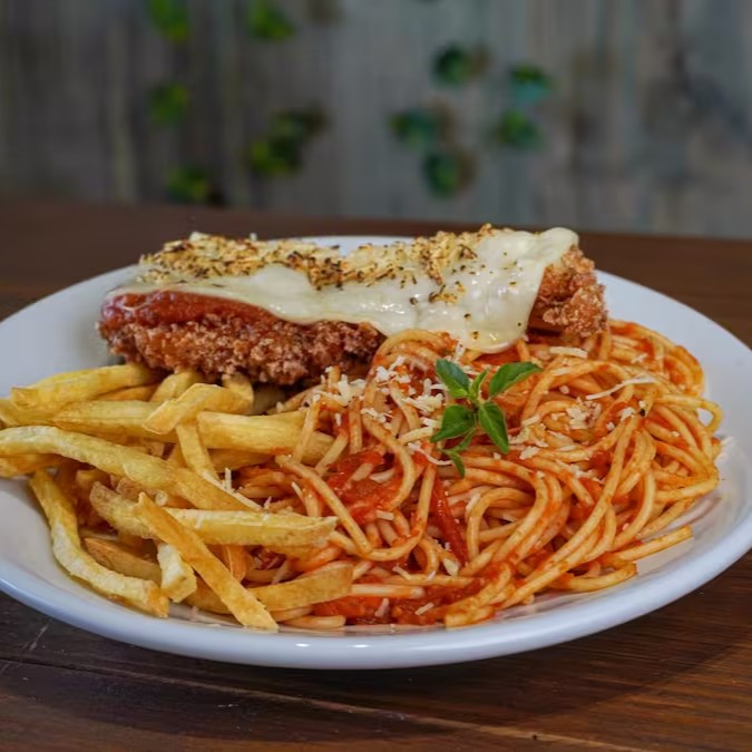 Frango frito, queijo mussarela e parmesão maçaricado, macarrão grano duro, molho artesanal e batata