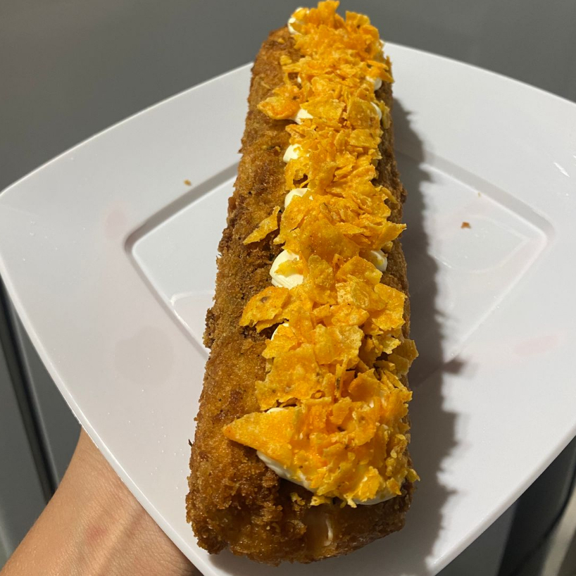 arroz, cream cheese, salmão,e doritos.