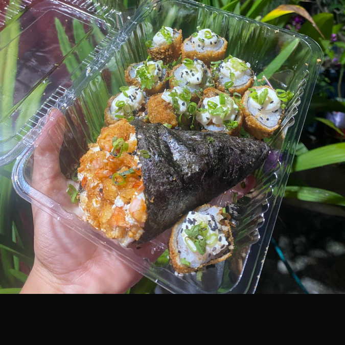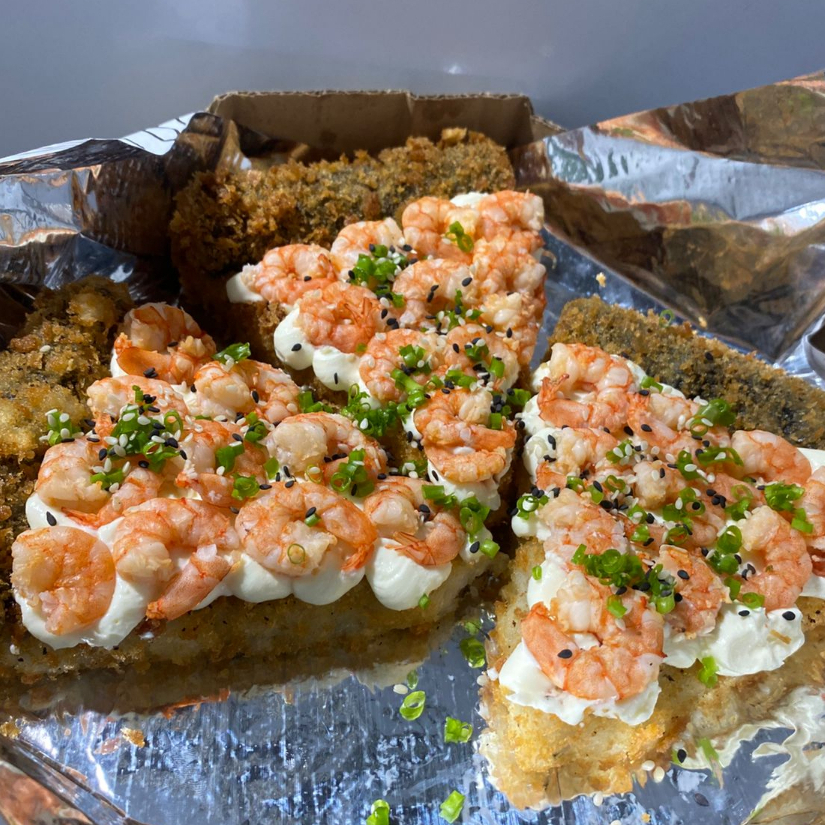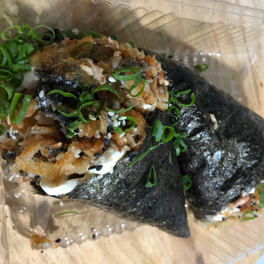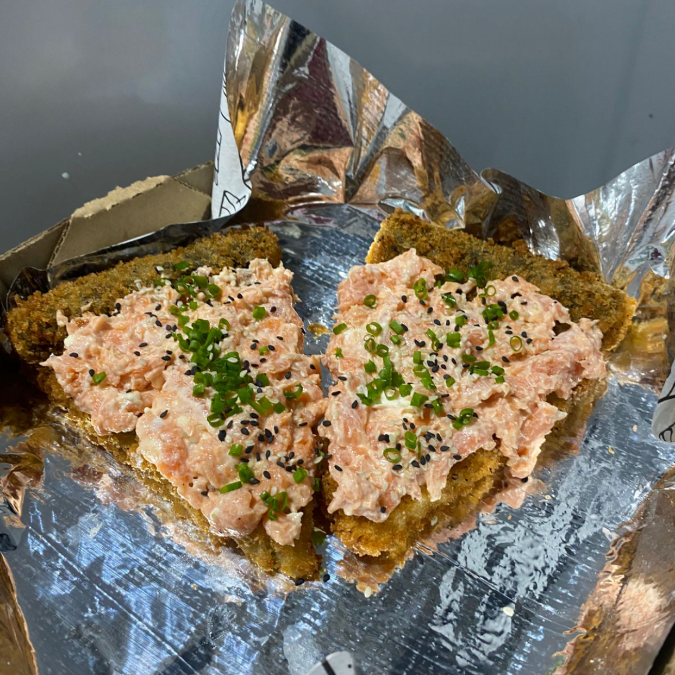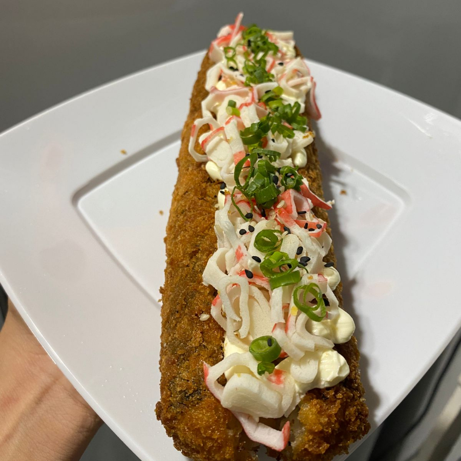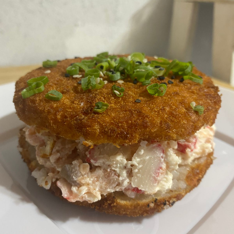 arroz empando e frito na farinha de trigo e depois na panko, moldado no formato de hambúrguer, depois de frito cortado ao meio e recheado com kani(carne de carangueijo), e cream cheese.