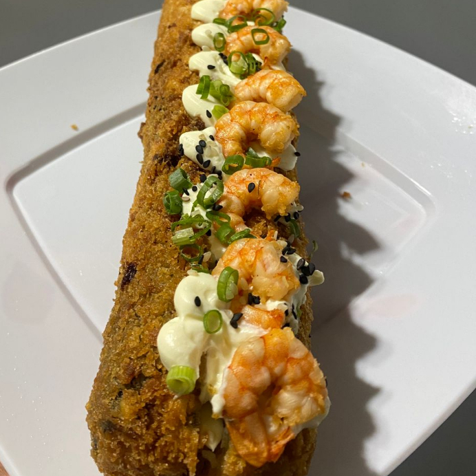 arroz empanado na farinha de trigo e depois na panko, depois de frito cortado ao meio e recheado com camarão já frito e cream cheese.