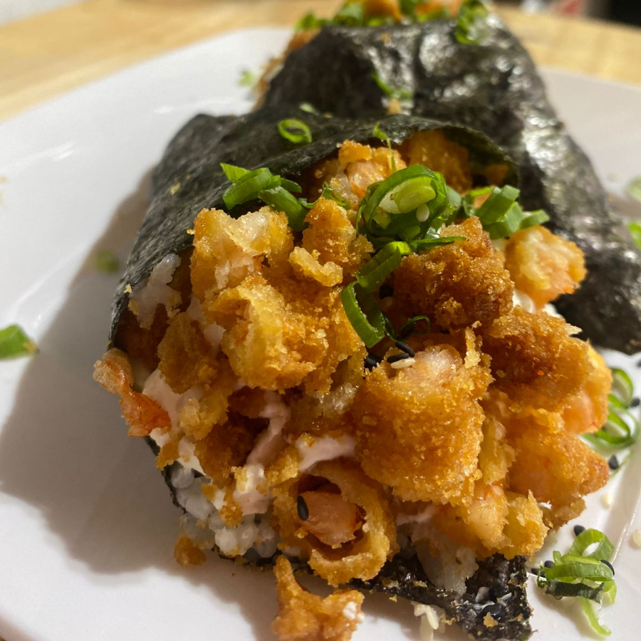 o temaki crocante de camarão vai com recheio empanado de camarão fresco cozido, arroz japonês temperado, alga nori, cream cheese,cebolinha e gergelim.
