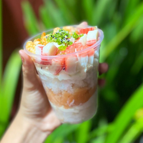 o copo vem com cream cheese, arroz,salmão(cru), kani-kama e camarão.