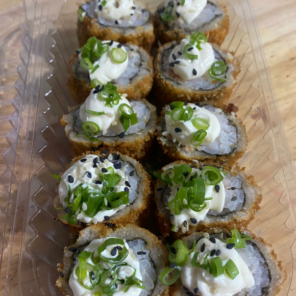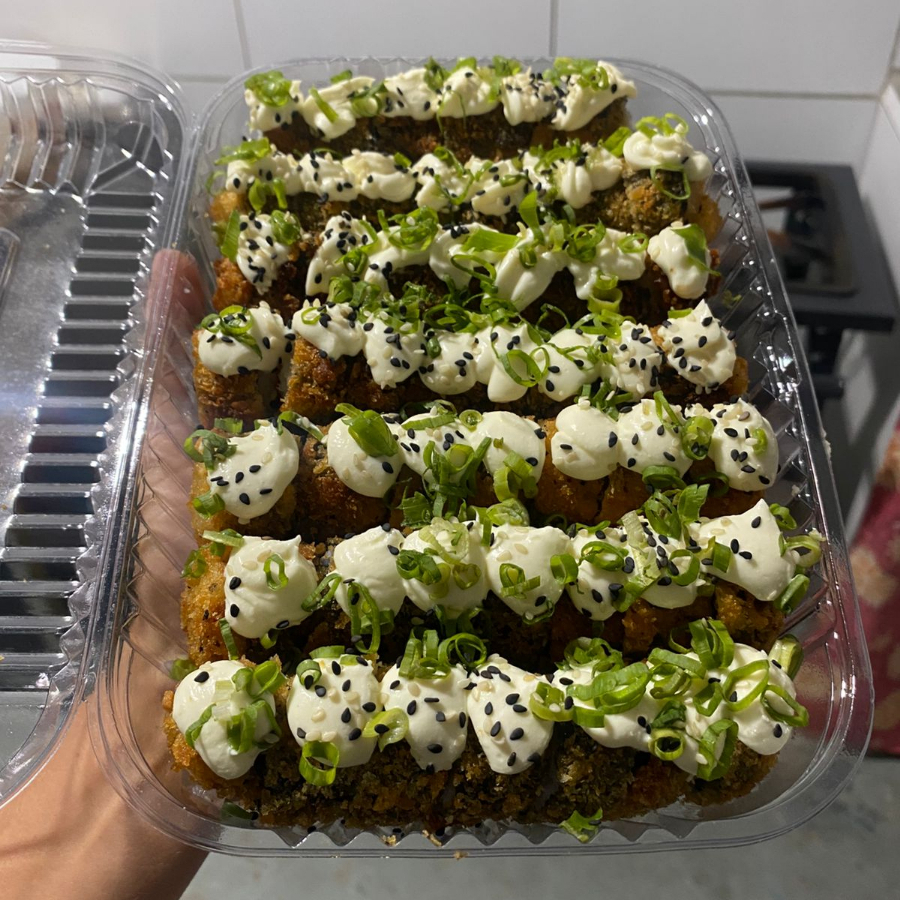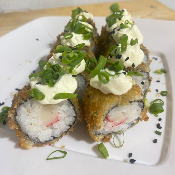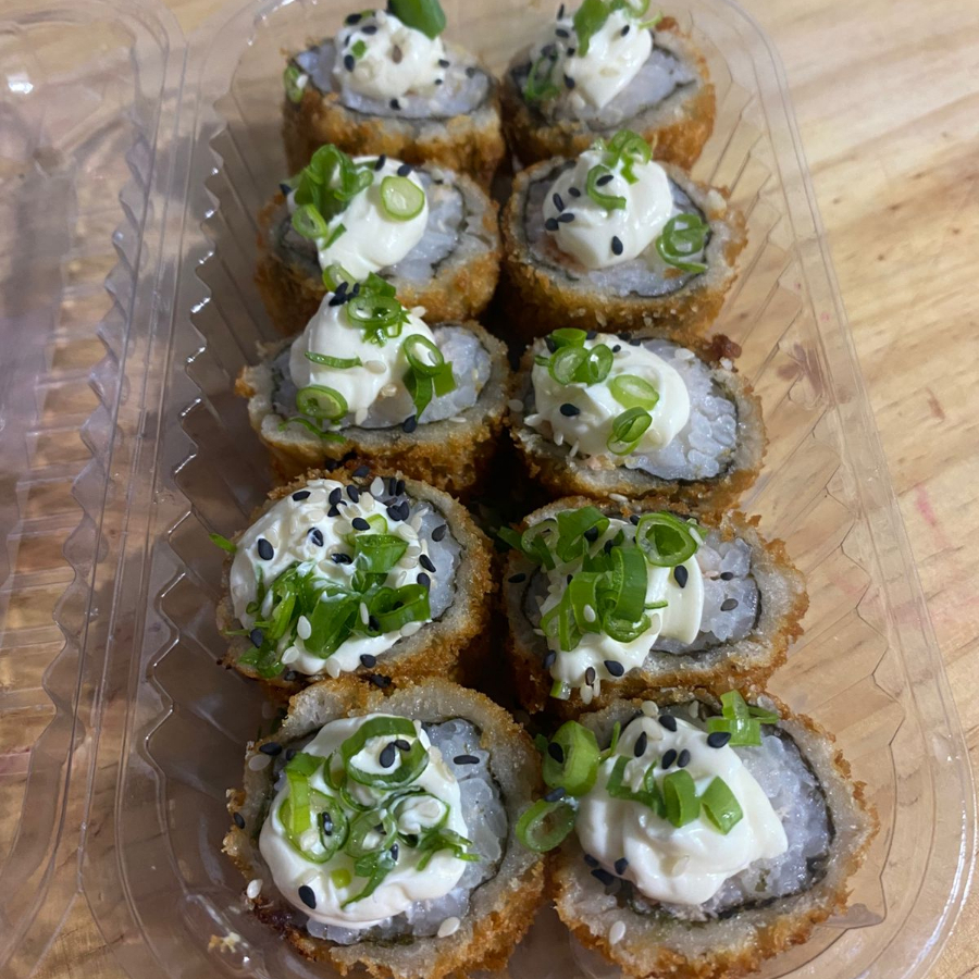 arroz japonês,alga nori,cream cheese,camarão frito,cebolinha e gergelim.