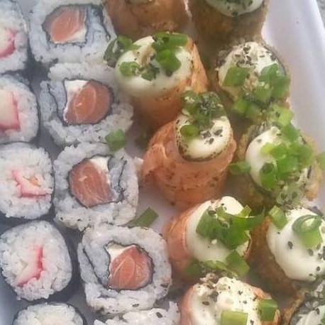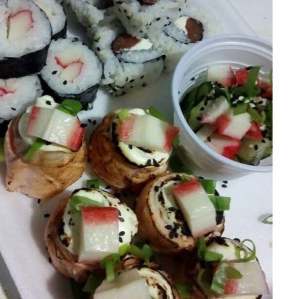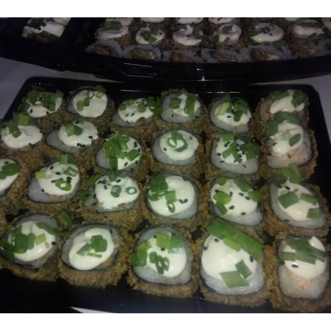 Sushi todo empanado e frito, com recheio de kani( carne industrializada de caranguejo), creme cheese e cebolinha.