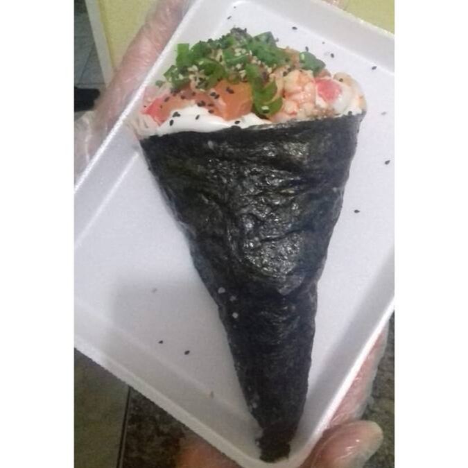 Temaki com arroz, salmão, camarão, skin, kani, creme cheese e cebolinha
