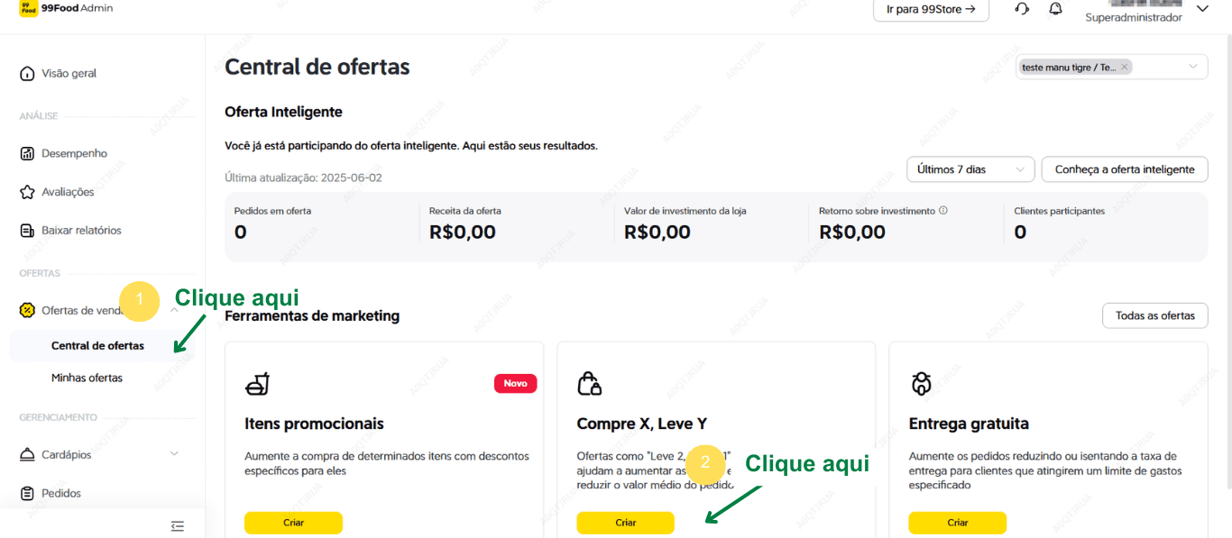Já dentro da Central de Ofertas, clique em “Criar ” dentro da caixa de Compre X, Leve Y