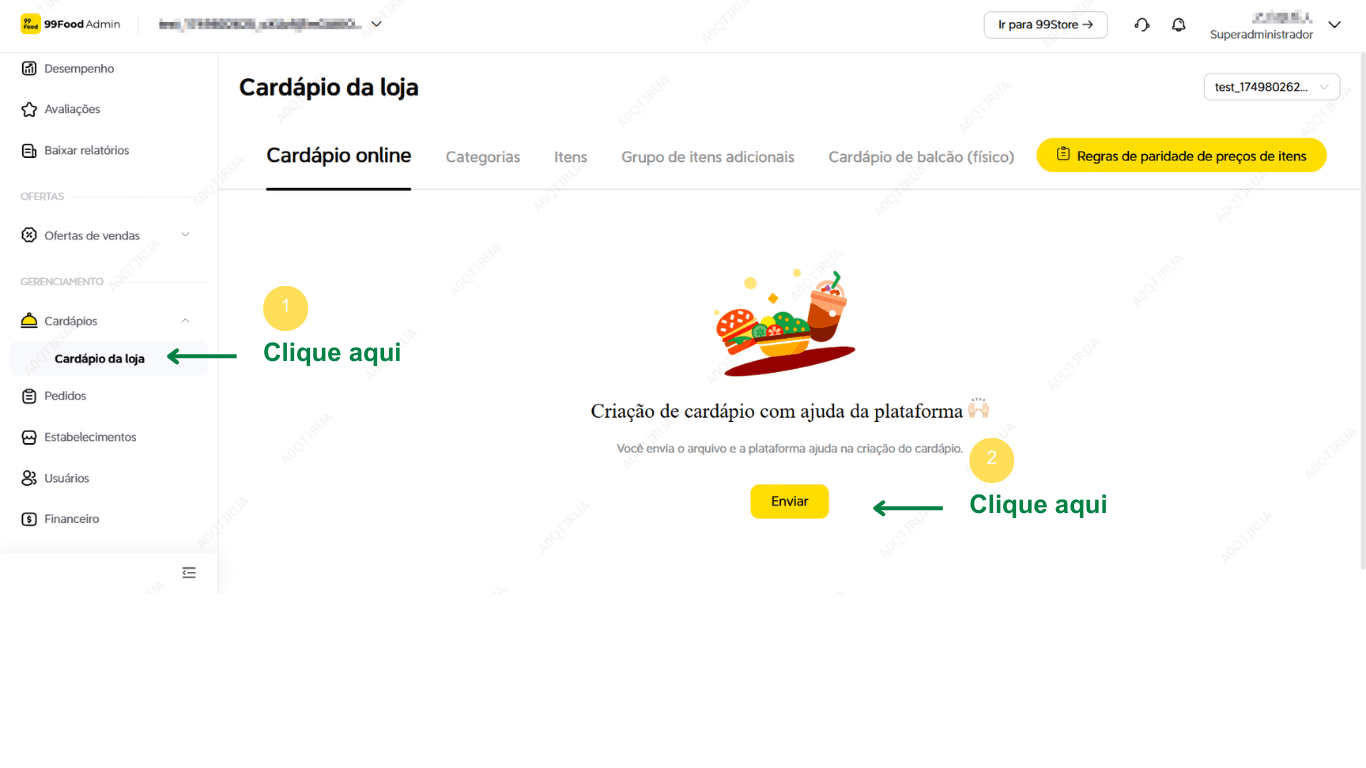 Ao entrar no aplicativo, clique no botão “Cardápio” à esquerda do menu. Em seguida abrirá o clique em “Cardápio da Loja”.