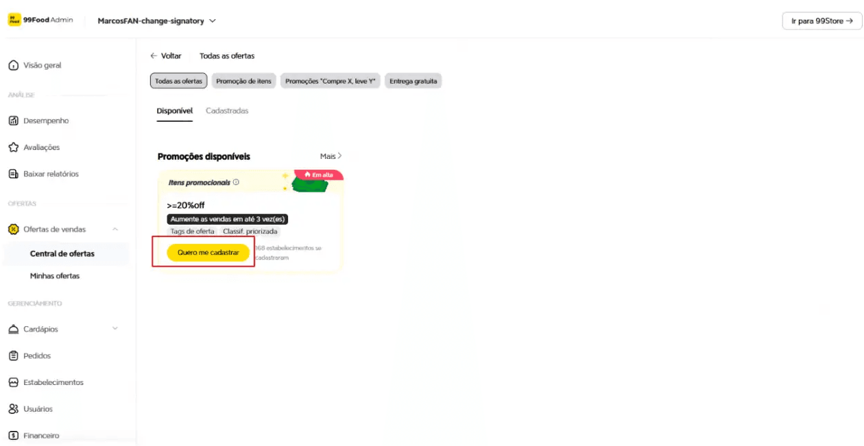 Encontre a campanha No seu painel, vá até a seção "OFERTAS" e clique em Central de ofertas . Localize a promoção que mais interessa e clique em Quero me cadastrar .