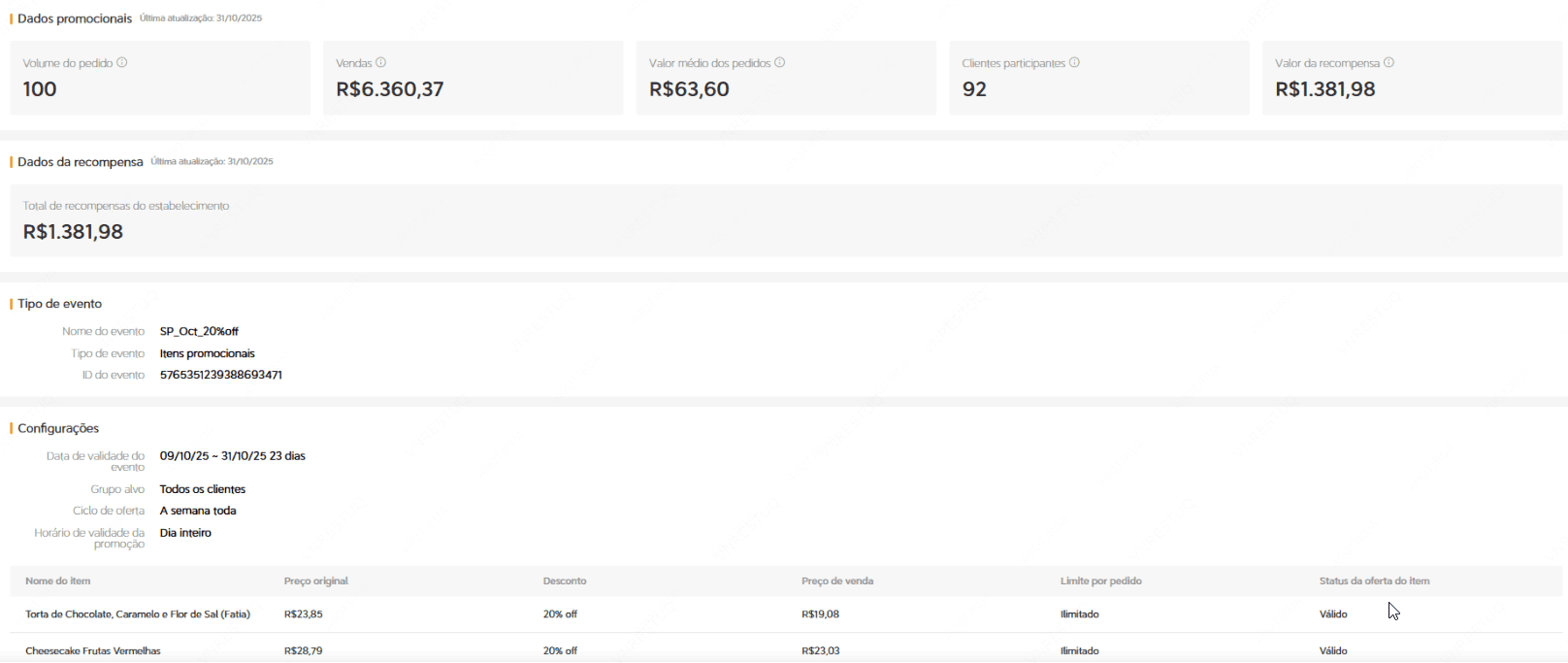 Clique em Detalhes para ver todos os dados de performance, como vendas, clientes participantes e o valor total da recompensa.