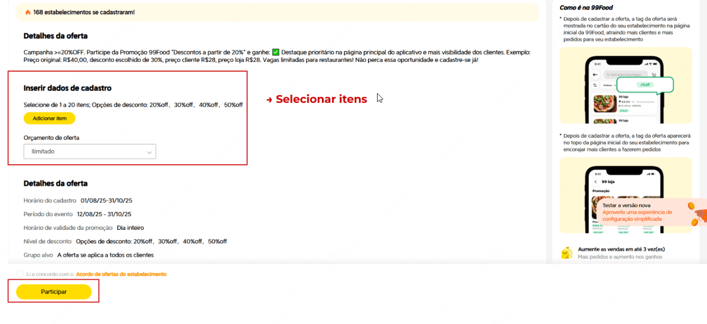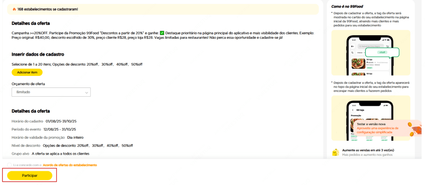 Defina o orçamento e ative De volta à página de cadastro, defina o Orçamento da oferta (se necessário), leia os termos e clique no botão Participar para finalizar.