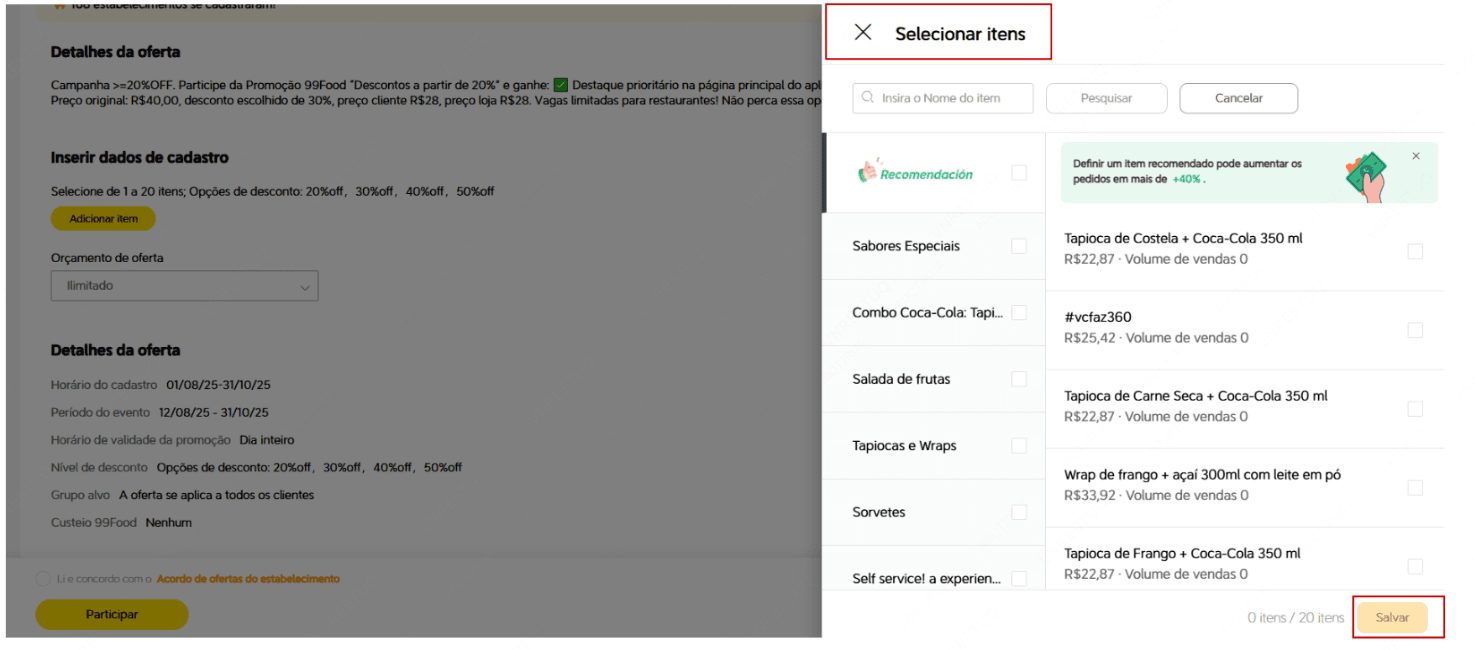 Selecione os produtos Uma janela irá aparecer. Aqui, você pode buscar e selecionar quais produtos do seu cardápio farão parte daquela promoção. Ao terminar, clique em Salvar .