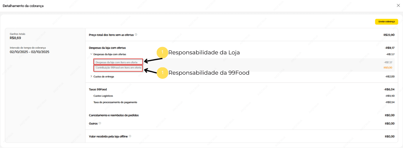 Este valor (exemplo: -R$ 29,00) é o que foi descontado do seu recebimento. É a "Responsabilidade da Loja".Contribuição 99Food em itens em oferta: Este valor (exemplo: R$ 0,00) é o quanto a plataforma colocou. Se estiver zerado, significa que aquela promoção específica foi totalmente patrocinada pelo restaurante.