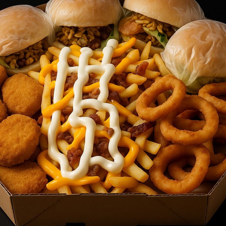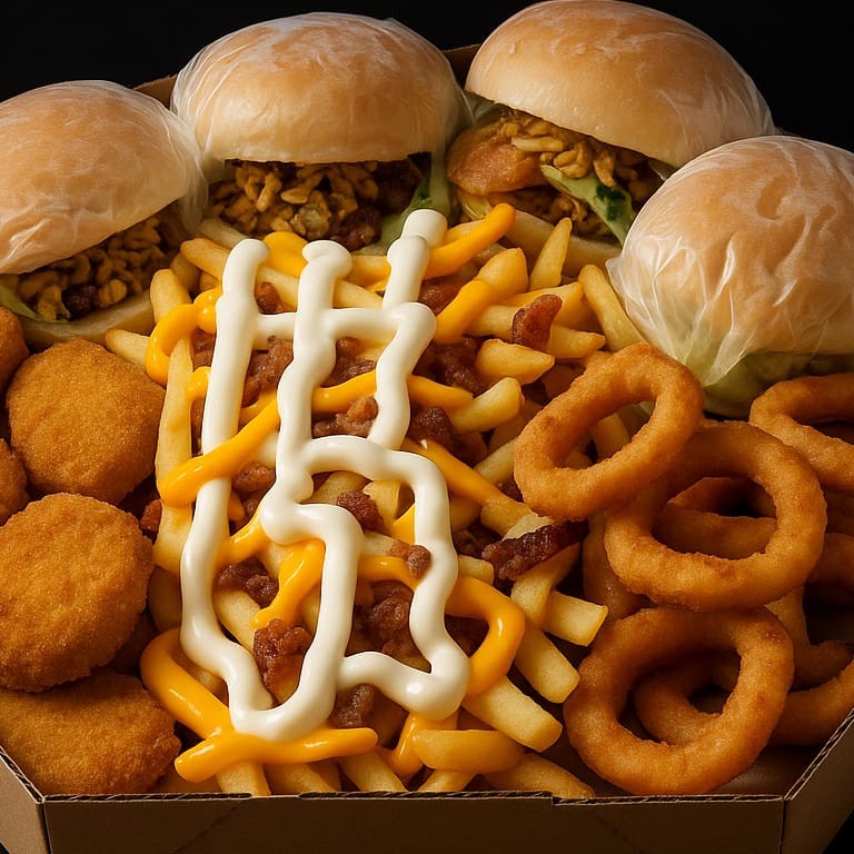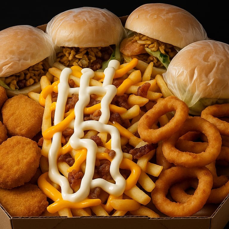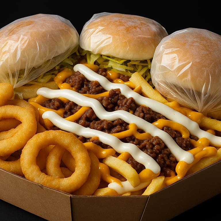 "(Acompanha: Lanches=pão, 3 carnes, 3 queijos e molho especial+ batata frita com cheddar, Catupiry e bacon+ 10 nuggets ou 10 aneis de cebola) ""Acompanha: um lanche incrível, preparado com um pão macio e quentinho, recheado com três carnes suculentas, três fatias de queijo derretido e um molho especial que une todos os sabores de forma perfeita. Para complementar essa delícia, você também recebe uma porção de batata frita crocante, coberta com cheddar cremoso, Catupiry e bacon, além de escolher entre 10 nuggets crocantes ou 10 anéis de cebola empanados. Uma combinação de sabores e texturas que promete satisfazer seu apetite de maneira irresistível!"""
