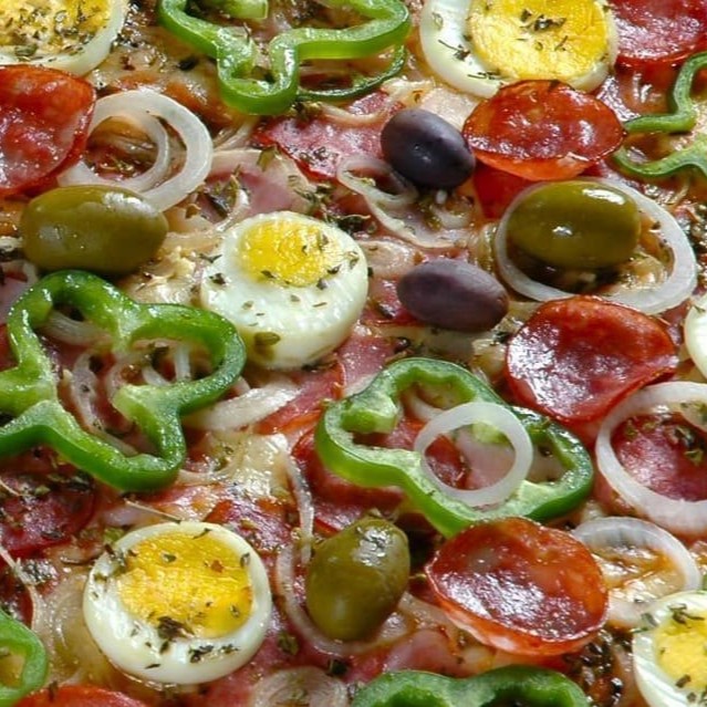 Molho de tomate artesanal, queijo muçarela, linguiça calabresa defumada, pedaços do nosso delicioso bacon, ovos de galinha, pimentão verde, tomate e cebola frescas, azeitonas verde, orégano e milho