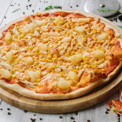 Um delicioso molho de tomate artesanal, queijo muçarela, um frango temperado no alho e ervas extremamante suculento, milho verde, cebola em rodelas fresca e aquela pitada de orégano pra finalizar.