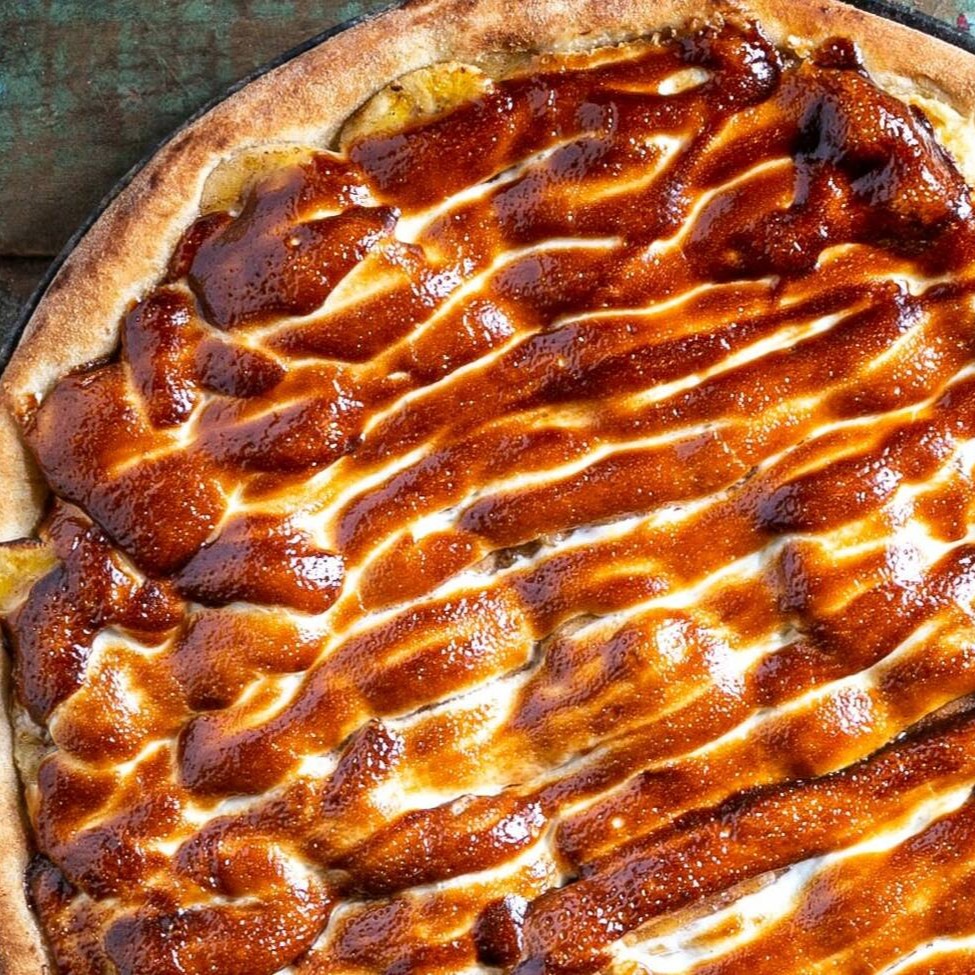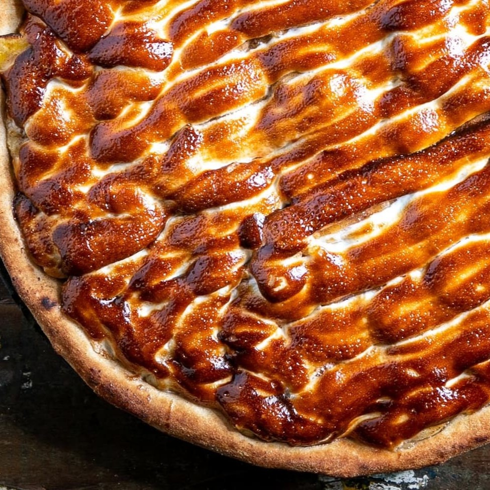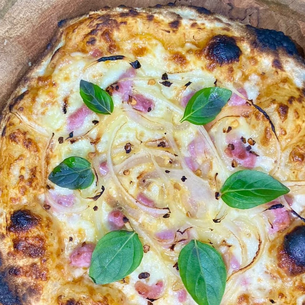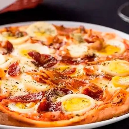 Um delicioso molho de tomate artesanal, queijo muçarela, aquele bacon extremamente saboroso, cebola em rodelas fresquinha, alho incrivelmente torrado e ovos de galinha.