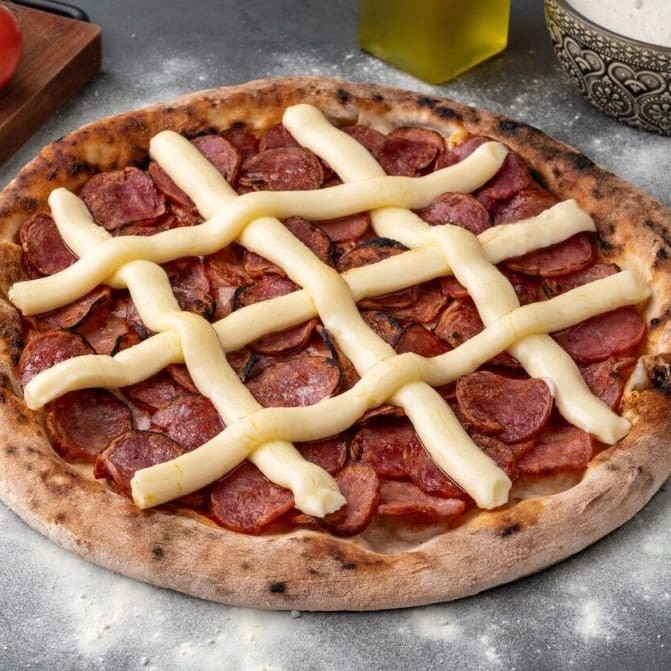 Um delicioso molho de tomate artesanal, queijo muçarela, linguiça calabresa defumada, cebola fresquinha em rodelas para dar aquele toque acebolado, azeitonas verde selecionadas e orégano.