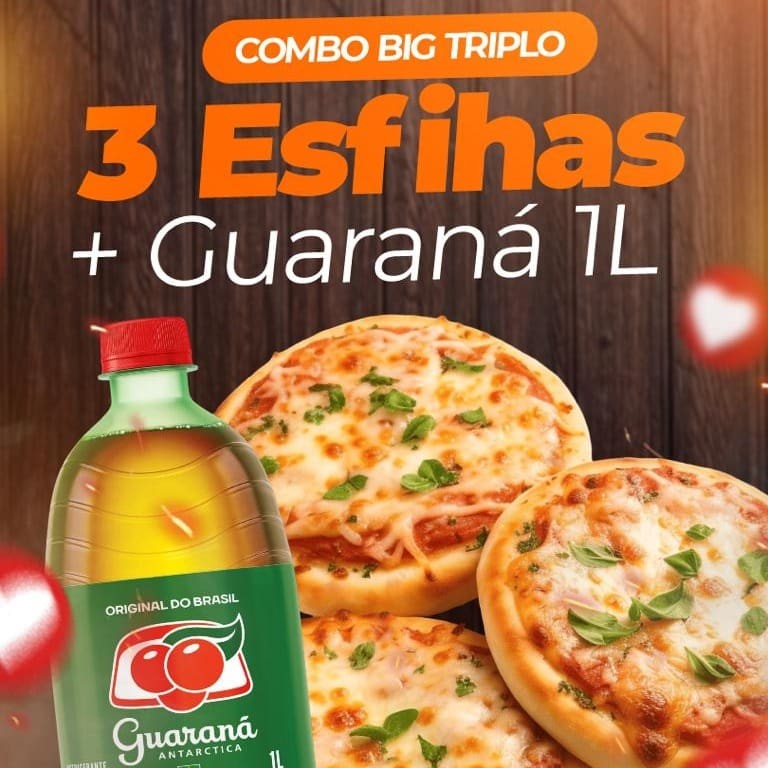 Aqui você leva três esfihas de 20cm e leva inteiramente grátis um Guaraná de 1l.
